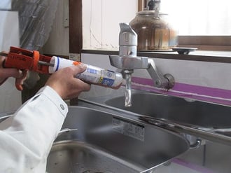 水廻りなので、防カビ剤入りシリコンコーキングで。