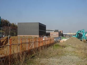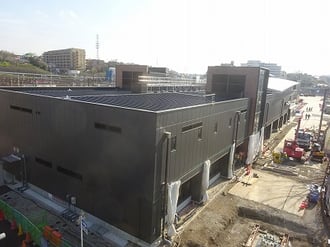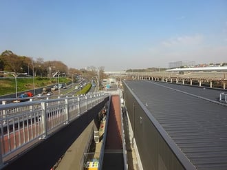 新横浜方面から・・・左側が羽沢横浜国大駅舎、右が横浜環状2号線の側道。