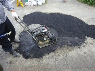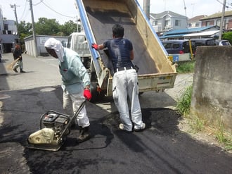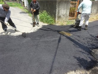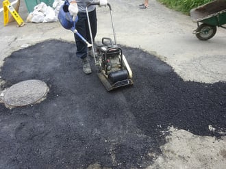 穴ぼこの空いている箇所に、アスファルトを敷きならし。