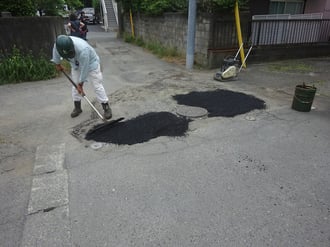 この穴ボコでは、車のハンドルが取られるだけでなく、自転車や歩行者も、ややもすると転倒しそうな勢い。