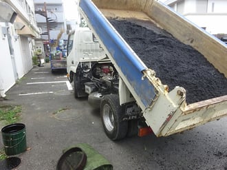 周囲の下がっているアスファルト部に、砂利を敷いて、転圧作業。(ホコリにならないように、水まきしながら)