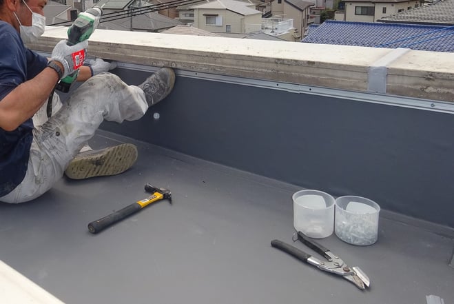 立ち上がり部は、密着工法で。端部から雨水が浸入しないように、シールして、