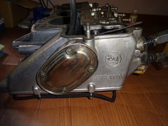 写真上側のエンジンヘッド穴から、腰下(ブロック)のカムから押されて、プッシュロッドが上下し、ロッカーアームを伝達して、バルブを開閉。