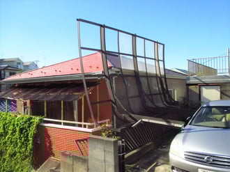 風でめくられるように倒れたカーポート。