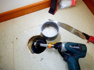 既存の便器を取り外した後に、塩ビ配管が接着剤で固定されているため、このままでは、新規フランジが取り付けられません。