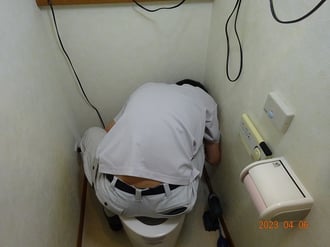 便器に座り込んで、奥の固定金物を止めています。