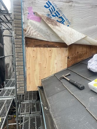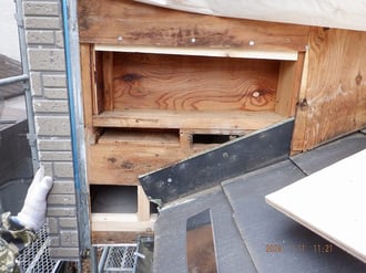 消毒をしてから、写真のように、下地合板を塞ぎました。(内部は雨水が外部に出るように誘導しています)