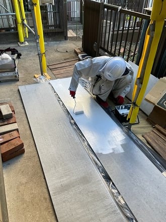 ベランダ笠木の寸法上、通気胴縁を取付けできないため、今後を考えて、サイディングの裏から雨水が染み込んで、またボロボロと剥離しにくいように、事前にエポキシ樹脂系塗料を塗っておきました。