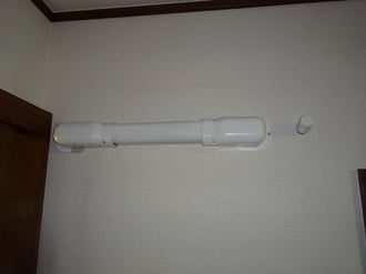 ここは、将来エアコンを取付けるかも知れないと先行配管された場所。 クロス紙を貼替えたお宅ですが、建築時に先を見据えて、このハウスメーカー様は、冷媒管と、排水ドレイン用配管を、予め壁体内に納められていましたが、見栄え的に好ましくないので、お客様の了承の上、少し手を加えました。