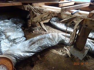 フローリングの重ね張り工事中に、既存床を安定させるために、ビス止めしていたら、【ぬか釘】の箇所があったので、了承の上、開けて見たら、大引きがシロアリに喰われていました。