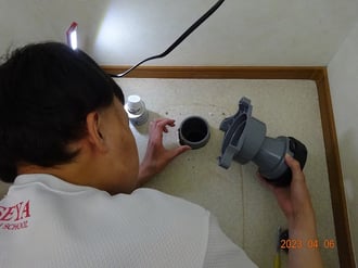 既存の便器を取り外した後に、塩ビ配管が接着剤で固定されているため、このままでは、新規フランジが取り付けられません。